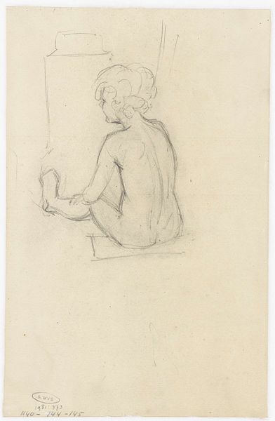 Curator: Jozef Israëls created this intimate pencil drawing titled "Twee zittende meisjes, buiten," sometime between 1834 and 1911. It’s currently held at the Rijksmuseum. Editor: My first impression is of fleeting moments and gentle tranquility. There's a sense of reverie about it; like capturing a peaceful pause in time. The light touch gives it a sketch-like immediacy. Curator: The informality certainly chimes with its historical context. As Impressionism took hold, artists moved away from posed studio settings towards more direct, naturalistic depictions. Israëls belonged to a generation grappling with new visual and social ideas. Editor: Right. What I notice is the hats shielding their faces - concealing a clear depiction of them but also perhaps suggesting hidden depths. Hats are loaded with symbolism – status, protection, even personality. It gives a symbolic dimension to an ostensibly casual scene. Curator: Exactly, and by not making them overly individual, the drawing perhaps becomes more representative of childhood itself during that era – ideas of innocence, potential, but also societal expectations. The ‘impression’ he creates becomes an artifact for studying socio-cultural conventions of childhood during his lifetime. Editor: The surrounding landscape seems both idyllic, a simple field, but is roughly etched in minimal strokes, reflecting how memory sometimes fades, with emotion rather than strict detail staying with us. Curator: What's particularly interesting is understanding how Israëls chose to present this 'slice of life' within a developing art market. Realism was burgeoning and impacting not just technique, but choice of subject matter, moving away from grand historical narratives. Editor: Yes. The simplicity focuses our attention, almost invites reflection. Perhaps childhood offers an enduring sense of nostalgia as we grow, always seeking a space of safety within nature. The sketch triggers this collective emotional longing, even today. Curator: And as a piece intended for public consumption, then and now, these are notions continually reinforced. What might seem to be an unremarkable vignette tells stories far beyond the paper's edge. Editor: A pencil sketch, an intimate, thoughtful portrait, brimming with meaning. A poignant reminder of the depth that simple things hold, perhaps.