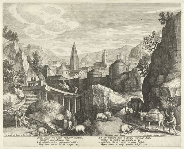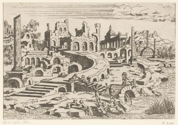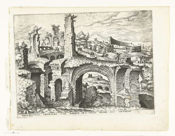 Editor: Here we have "Job on the dunghill with his wife and three friends," an engraving dating back to 1556. The stark lines and desolate landscape really evoke a sense of profound suffering. What stands out to you, and how do you interpret this scene? Curator: The image participates in a longer history of representing biblical figures, specifically the story of Job, as public lessons. This print circulated in a period of intense religious and social upheaval; think about the Reformation, the rise of print culture itself. The decision to depict Job amidst crumbling Roman ruins transforms the biblical narrative. How do you think this setting functions in the context of 16th-century viewers? Editor: Maybe it's about showing the decay of past empires and contrasting that with enduring faith, or questioning the earthly power, and the promise of God? Curator: Precisely. Consider also how this image might function within the broader political landscape. Prints like these served to disseminate not only religious, but also moral and social commentaries to a broad audience. This image's political potential resides in its critique of earthly power and fleeting human affairs. What do you make of the figures surrounding Job? Editor: His friends seem to be gesturing emphatically, maybe arguing or trying to advise him, while his wife is looking downcast, away from him. Curator: Notice how they are rendered within this historical landscape, highlighting social tensions of the time – debates around poverty, faith, and moral responsibilities in a visually potent and accessible format. Editor: This really helps me understand the image as more than just a biblical scene but also as social commentary. Thank you. Curator: Indeed, by recognizing how art engages with history and society, we gain richer understandings of the art itself and its dynamic role in our culture.