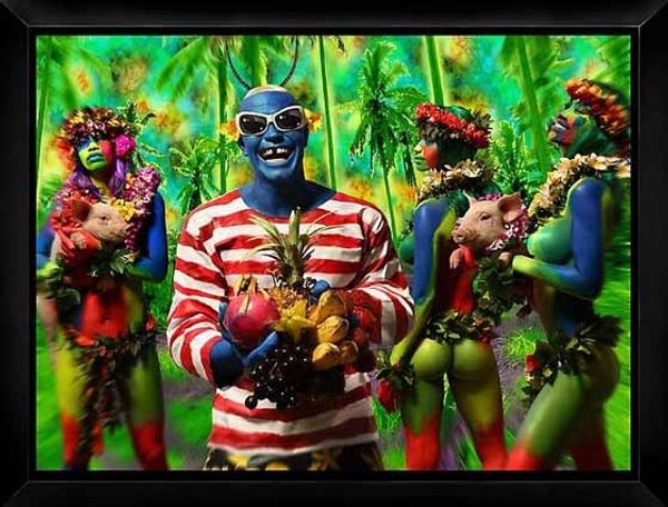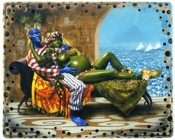 Curator: This is "Yellow Canoe," a mixed-media piece by Ashley Bickerton from 2010. The artist blends acrylic paint with other materials to create a vibrant, almost surreal landscape. Editor: My first impression is sensory overload! It's intensely colorful and theatrical, with these alien figures floating in this clear water filled with flower petals. It feels staged, but in a very intriguing way. Curator: Exactly. Bickerton often uses appropriation as a central theme, referencing and remixing imagery from diverse sources. In this work, there’s a deliberate tension between the idyllic tropical scene and the strange, unsettling figures within it. This prompts a conversation about how culture, power, and identity intersect. Editor: The choice of a canoe, traditionally a symbol of exploration and connection to nature, now seems fraught with symbolism. Are the figures natives or invaders? What stories are buried beneath all those bright flowers? The artist employs visual tropes associated with the tropics, almost to the point of hyperreality. Curator: The blue-skinned figure holding what appears to be a high-tech energy drink under a parasol challenges the very notion of 'authenticity.' It is post-colonial critique via the lens of hyper-consumerism and the commodification of paradise. He places the native, rifle in hand, holding an infant— almost the modern day Madonna and Child. Editor: The rifle held by the green figure is a very strong element and stands in striking opposition to the flower crown. The whole scene teeters between a tropical advertisement and a silent threat. It asks, who is the "other," who benefits, and at whose cost? Curator: Thinking about our contemporary understanding of global economies and the ever presence of western pop culture, it's challenging to not interpret the yellow canoe, not as something simple or of one message, but rather, as a complex, often conflicting story of modernity, with an island narrative steeped in cultural appropriation and the loss of indigenous cultures. Editor: It reminds us of how symbols evolve, acquiring new, often contradictory, meanings as they travel through time and across cultures, leaving layers of context in their wake. Curator: And in turn we, the viewers, are left questioning our own relationship to the visual and material languages present here. Editor: Precisely. A vibrant visual experience.