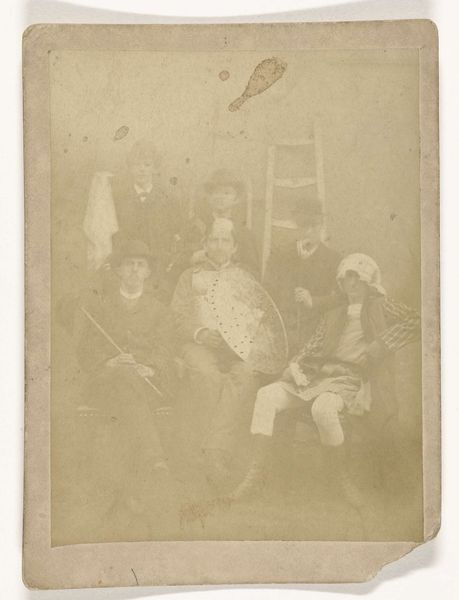Editor: Here we have a gelatin silver print from 1887, titled "Groepsportret van vijf studenten," created by Israël David Kiek. The muted sepia tones and the poses of the students lend the image a very formal, almost academic feeling. How do you interpret this work through a formal lens? Curator: Formally, this work intrigues. Consider the photographer's control over light. The diffused lighting, particularly on the central figure holding the cane, directs the viewer’s eye. How does that relate to the subjects’ poses? Editor: It seems like the central figure, slightly elevated, becomes the focal point. Is it a choice highlighting a hierarchy, or perhaps seniority, within the group? Curator: Precisely. The arrangement of the subjects in a pyramidal composition further reinforces this. Note also the varying textures – the smoothness of their jackets versus the grainy quality of the background, the light creating soft but consistent shadowing. How do these formal elements contribute to the overall meaning, or the message, being communicated? Editor: I guess the textures emphasize the tangible nature of the clothing and subjects themselves, bringing the group into focus, whereas the soft background suggests perhaps a generic setting, putting more weight on the subjects and their internal relationships rather than the time/place? What purpose does that distinction provide? Curator: That reading is certainly valid. It asks, What do you think of their spatial and relational organisation with those choices in mind? How are the elements arranged to convey their significance? Does the relationship tell us something? Editor: Considering it from a relationship context and thinking about academic artwork and portraiture, it almost seems like the group is aware they are supposed to portray some sort of idealized bond of student life and academia, though there is perhaps no visible indication it exists. The formality is just on the surface to perform for the artist/viewer. Thank you! I never would have noticed those aspects looking only at it from a historical context. Curator: Indeed, these visual elements speak volumes. And through close inspection and analysis of choices in spatial relationships and photographic representation, one will find greater nuance each time, reflecting deeper and everchanging insights.