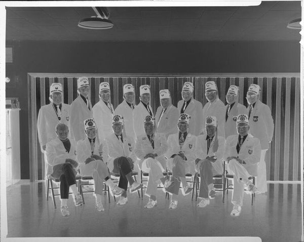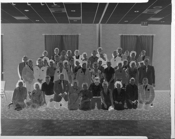 Editor: This is an untitled photograph by Hamblin Studio from the Harvard Art Museums, depicting a group portrait. It strikes me as a very formal gathering. What do you see in this piece? Curator: The photograph’s inversion reveals the racial dynamics inherent in portraiture. It asks us to consider who is seen, who is made visible, and for what purposes, especially when race and representation intersect. Who is empowered by this image, and what statements does it convey? Editor: So, you're saying that the formal arrangement might reinforce existing power structures? Curator: Precisely. The photograph is not simply a record of an event but a carefully constructed narrative about community and belonging. Editor: Thank you. It's given me a lot to consider about the role of photography in shaping social perceptions. Curator: Indeed. It's a powerful reminder of the stories images can tell, and also the stories they can conceal.