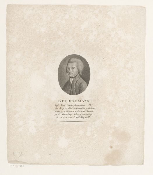 Curator: Here we have "Portret van Johann Ulrich Wallich," an engraving residing here at the Rijksmuseum. The piece is dated somewhere between 1775 and 1834, but bears the mark of a much older style. What are your initial thoughts? Editor: Haunting, isn’t it? It feels like peering into a very fragile past, as though the paper itself might crumble to dust if I breathe on it. There's a solemn quality, the weight of history, all in those etched lines. Curator: The engraving style, with its emphasis on line and detail, speaks to a particular visual culture, right? We see this mode frequently employed during the Baroque period. Consider how this aesthetic might reflect the sociopolitical hierarchies of the time. Editor: Exactly! It reminds me of old maps—precision, control. There's a deliberate attempt to capture a likeness, sure, but it's also about conveying status, maybe a bit of idealization too? His gaze, the cut of his clothing... It's curated, just like everything else back then. Curator: Indeed. Portraits such as this served as tools for establishing identity, power, and legacy. Wallich’s pose, his garments, his overall presentation—these all convey a certain degree of societal standing and authority. This aesthetic operates within a set of conventions dictated by his social position. Editor: So true. Though, seeing it today, removed from its original context, it prompts me to question: what does this image mean to us now? Do we simply admire the craftsmanship, or can we somehow connect with this long-gone man and what he stood for? Does he stand for anything, in particular? Curator: Perhaps by examining the various intersecting power dynamics at play – class, gender, religion - we can open up more space for a critical engagement with works like these. Editor: Beautifully put. I might walk away pondering the transient nature of fame. Curator: And I, the role of representation in solidifying social orders. A rewarding glimpse into history.
