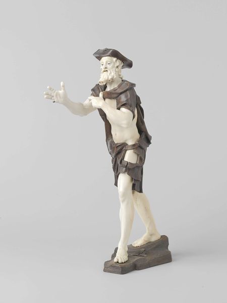 Curator: Welcome. We are standing before "Bedelares met kind," or "Beggars with child" by Simon Troger, dated before 1768. It’s a compelling baroque sculpture fashioned from wood. Editor: Wow, that hits hard. She's so vulnerable, yet there’s a quiet strength in her posture. The gaunt face and ragged clothes, you know, they tell a story of hardship etched in every groove. It is difficult to witness something like that. Curator: Indeed. Notice the artist’s deliberate use of contrasting light and shadow to accentuate the contours of her face and clothing. The linearity in the cascading tears of wood around her, creating a sort of halo, further draws us in to examine the condition of this woman. What about the figure on her back, almost like an angel. Editor: I love the term cascading tears, what a poetic, elegant phrasing. It gives a movement to the work. But that child seems… detached. Almost more like an extra weight, a stone she carries along, more than part of her. The sculpture hints at burdens unseen, societal neglect maybe. And this walking stick of hers seems both support and weapon, no? It can fend danger off...but also signal hardship. The question is: did Troger mean to idealize such a vision, to simply show what happens, or something more complex. Curator: The intentional juxtaposition of poverty and implied religious iconography through that almost angelic infant suggests a commentary on charity, on those often overlooked in society. Considering the historical context of Baroque art with its ornate detailing and theatrical displays, Troger subverts expectations. He simplifies, perhaps challenging the social norms of his time. Editor: He simplifies while being ever-so complex, it’s this contrast that I am starting to admire so much. This woman's clothes reveal just as much as they cover! It brings a raw immediacy to the piece... and makes me question my role as observer. We observe this figure but, at what expense. Is it just entertainment, or a real questioning about values. Curator: Yes, an acute observation. The raw materiality of the wood itself speaks to the harsh realities faced by the underclass, prompting introspection on the viewer’s own position. Editor: A thought-provoking dance between observer and observed then. It brings so many thoughts... Troger achieves a poignant moment frozen in time. This is far from what its mere materiality represents!