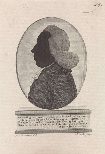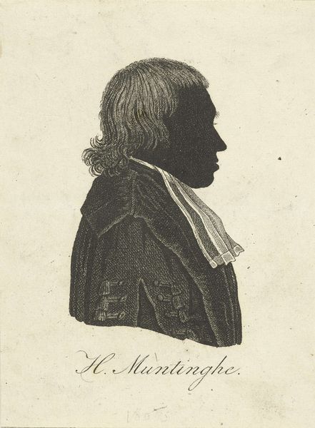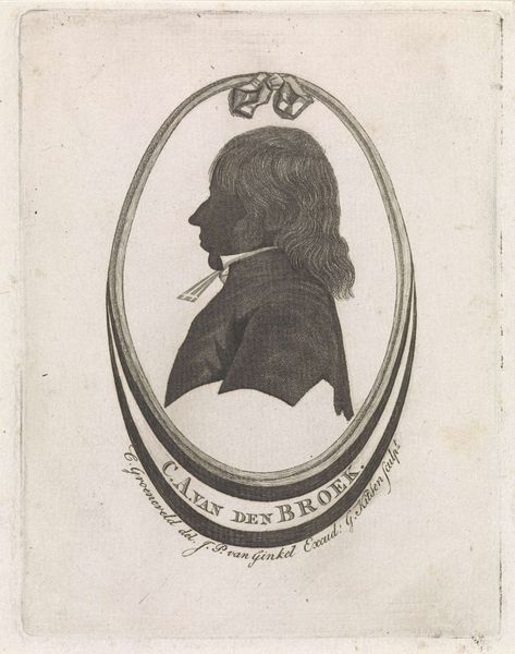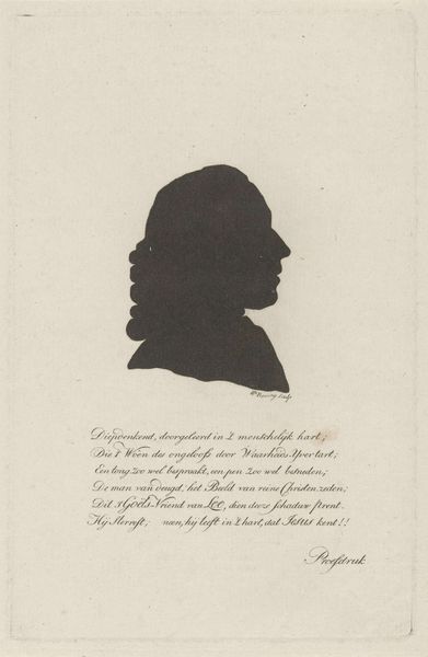 Curator: At first glance, this strikes me as rather severe, a study in stark contrasts. The heavy shadow gives it a dramatic, almost imposing presence. Editor: Agreed. Let’s delve deeper into "Portret van Johannes Henricus Scholten," attributed to Johann Peter Berghaus, and tentatively dated between 1853 and 1854. What intrigues me is the meticulous execution of this print, seemingly an engraving, which sits within the Rijksmuseum collection. Curator: The oval format is quite conventional for portraiture of this era, a conscious choice to evoke classicism and authority. But consider how the stark black silhouette disrupts that expectation. It resists easy readability, doesn't it? Editor: Precisely. Thinking about it from a production angle, creating such a crisp silhouette through engraving demanded immense skill. The artist had to negotiate with metal, line and acid to convey mass with a play of voids, challenging the assumption that images are defined by accumulation of matter. Curator: Good point. That void speaks volumes, or rather, silences. The eye struggles to resolve detail within that darkness, pushing the viewer to consider what's being deliberately concealed. A face both present and absent... Editor: Absolutely, and that void emphasizes Scholten's clothing: the crisp collar and draped garment; consider how that interplay performs power! It's tempting to decode what his clerical garb could communicate about 19th-century Dutch society too. Curator: Perhaps the shadow then symbolizes a specific intellectual posture, or perhaps spiritual doubt within this prominent theologian's life? Berghaus offers no easy answers. It prompts more questions about the man's inner life than it resolves. Editor: I'm more inclined to read into it the material processes that give shape to that life, tracing the economic infrastructure embedded within an artisanal print tradition of that era. To render an academic elite meant access to specific knowledge economies. Curator: So, where does that leave us with Johannes Henricus Scholten? A somber figure rendered with superb formal control, ripe with potential interpretations. Editor: A testament, really, to the lasting significance of an artwork rooted within craft labor to communicate not only presence, but also to invite us to interrogate material and social contexts of that presence.