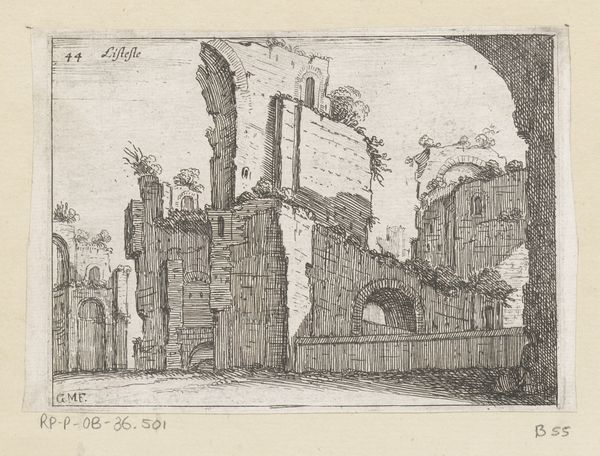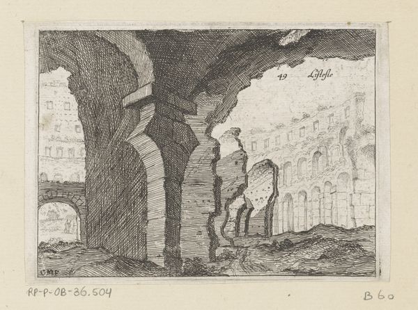 Editor: Here we have Giovanni Battista Mercati’s “Resten van het Colosseum te Rome,” from 1629. It's an engraving, a glimpse into the past. I'm struck by the decay, this tension between the grandeur of the Colosseum and its ruinous state. It feels almost…melancholic. What do you make of it? Curator: Melancholy, yes, that's a perfect starting point. The lines feel almost like whispered secrets of history. Mercati wasn't just showing us stone and archways, was he? I wonder if he was grappling with time itself. Consider the figures he places within the ruins, tiny in comparison—how does that affect our understanding of power, of civilization? Editor: It's a stark contrast! They seem so insignificant against the scale of the ruins. Almost like nature is reclaiming what was once theirs. Curator: Exactly. Think of the Baroque period: full of drama and heightened emotion. And yet, here’s Mercati choosing quiet contemplation, allowing the Colosseum’s decaying beauty to speak volumes. It makes you wonder what other meanings it tries to whisper us…almost a warning that everything turns into dust. What stories do *you* see swirling in the Roman sky above? Editor: A story of decline, but also resilience. The ruins are still standing after all those centuries. It's like a memento mori and celebration of human achievement all rolled into one. Curator: Beautifully put! It's in that very duality, the interplay of grandeur and decay, that the drawing finds its voice. A ruin isn't just what is lost; it's also what remains, stubbornly, defiantly, whispering stories of empires to anyone who'll pause to listen. I learn the whispers when seeing the decay in front of the vast skies as if its ghost haunts us forever. Thanks for making me pause and rethink. Editor: My pleasure, this gave me another perspective. Now, I have some pondering to do myself.