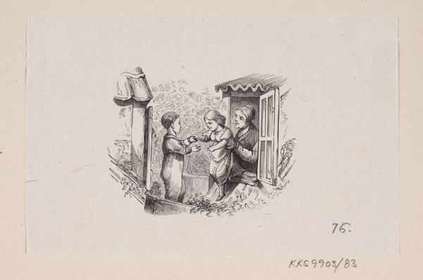This is an illustration by F. Hendriksen for Johan Krohn's "Peters jul," made sometime in the late 19th or early 20th century. It is made by etching, a printmaking process where lines are incised into a metal plate using acid. Look closely, and you'll see that the image is created from a dense network of tiny etched lines, defining the forms and creating tonal variation. This labour-intensive process was crucial to the expansion of the mass media and the book industry, and thus to the wider distribution of culture. Consider also the way the drawing mimics a child's perspective through the composition. It is as if the artist has captured the world through a child's eyes. The medium of print is perfect for this type of intimate imagery, allowing for the widespread circulation of these scenes. It reminds us that even seemingly simple illustrations are products of specific technologies, labour, and social contexts.