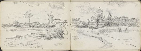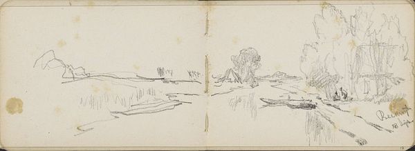 Curator: Willem Cornelis Rip created this drawing, titled "Gezicht op Elst," sometime between 1905 and 1910. It's a pen and pencil sketch on paper. Editor: There's a certain quietude that comes from the work's subtle rendering. Note the careful application of lines to give depth and form. Curator: Considering Rip's Realist and Impressionist tendencies, it’s tempting to situate this drawing within the context of the burgeoning Dutch art scene at the turn of the century, a period where artists were increasingly focusing on the intimate and familiar landscapes of their immediate surroundings. Editor: I am really interested in how the blank left side mirrors the complexity of the landscape. It provides a really stark visual comparison. Curator: I think that negative space creates an opportunity for contemplation and perhaps alludes to a dialogue about modernity versus the slower rhythms of rural life depicted on the right side. The composition, which juxtaposes the spare and the intricate, raises questions about our relationship to landscape and place during the late 19th century. Editor: To continue with the visual comparison, on the right side, note the details of the clustered buildings. Also, consider the textural richness. There is almost a nervous energy embedded in the layering of light strokes of his pen that create volume. Curator: Absolutely, and think about how this reflects the increasing urbanization of the Netherlands at this time, prompting a nostalgic gaze toward the countryside and simple village life. The art market began to favor intimate depictions of rural life. Editor: Ultimately, whether one privileges the subject or the visual mechanics of the medium itself, what is on offer in Rip's work is his remarkable capacity for distillation and attention. Curator: Precisely. Seeing how this sketch operates as both an aesthetic object and as a signifier of broader cultural shifts invites a more nuanced perspective of Dutch identity during the period.