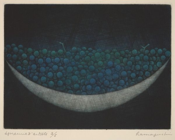 Editor: So, here we have Yōzō Hamaguchi's "Bowl of Grapes," which seems to be a monochrome etching. It's remarkably simple, a bowl filled to the brim, but somehow feels weighty, substantial. What strikes you most about this work? Curator: The beauty of Hamaguchi’s work lies in its masterful manipulation of tone and texture. Observe how the velvety darkness of the background presses forward, almost eclipsing the light emanating from the bowl. It’s not just an image of grapes, but a study in the relationship between light and shadow, positive and negative space. The semiotic implications of the form should also not be disregarded. The stark, geometric shape positioned below the grapes—does this add anything to its presence or affect the overall dynamic? Editor: That tension between light and shadow really enhances the grapes' dimensionality. It makes the image feel so much more substantial than just a simple still life. Are the shapes included for more balance? Curator: Indeed, this carefully considered composition leads the eye. Hamaguchi expertly varies the intensity of the blacks, creating subtle gradations within what might otherwise be a flat image. The grapes, nearly uniform in shape, invite an analytical look at form versus depth, which speaks volumes to their own construction as spheres as well as within the arrangement. What are your thoughts on the stark simplicity versus representational elements? Editor: I hadn't considered that at all. Seeing how Hamaguchi plays with depth makes the piece much more thought-provoking than initially apparent. This reminds me about formalism now too, when we think about these shapes and contrasts. Thanks! Curator: You're most welcome. Understanding the visual language allows us to decode and interact more deeply with any work of art.