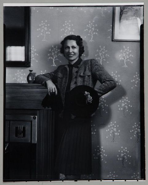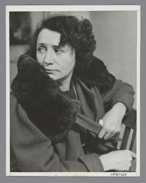 Curator: This is a fascinating portrait from 1934. The piece, entitled "Portret van Loma Joe," is a gelatin silver print. Editor: She looks a little… haunted? There’s this deep melancholy hanging over her, a stillness that’s both captivating and unsettling. The way the light catches the corner of her eye is full of emotional weight, as though she carries a whole world of unspoken stories. Curator: Absolutely. Photographic realism, particularly portraits from this era, were often meant to convey inner psychological states. The details like the button on her coat, the texture of the fabric, seem to solidify her presence, yet there's an ethereal quality at the same time. Her slightly averted gaze suggests a story or truth not immediately accessible. It is, perhaps, an intentionally ambiguous construction. Editor: Right, like she’s protecting something, or bracing herself. The gesture with her hand near her collar, it’s so subtle, but there’s a palpable tension there. Do you think it’s conscious? That the subject or the photographer, created this effect, to communicate to some intended viewer of that era? Or even perhaps to modern eyes now? Curator: I think so. This wasn’t merely documentary, it was an active composition, like constructing a character in a play. Realism was also shifting towards conveying a more complex, layered version of the self, hinting at the struggles of the era. Editor: So much comes through even without bright colors. Black and white amplifies the shadows, highlighting this raw emotional landscape of the sitter. The way the image almost romanticizes what appears to be hardship. Curator: True. It reflects the photographic aesthetic of the period, lending it timeless appeal. Editor: Yeah, it kind of holds your attention. Not in a flamboyant way, but like a quiet confession. Curator: An interesting perspective, that quiet honesty is definitely there. Editor: Loma Joe. I will have to meditate about that person, it looks like such a portrait of introspection. Thank you.