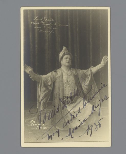 Here we see René Lonthie’s portrait of the tenor Louis Dister, likely made to commemorate his role as Marouf. Note the costume and upward-pointing index finger—a motif resonating through centuries. This gesture, seemingly simple, is laden with meaning. In antiquity, a similar upward point could signify divine inspiration or heavenly guidance. Think of John the Baptist in Renaissance paintings. The gesture transcends time. Here, it evokes a sense of aspiration or appeal to a higher power. The theatrical context adds another layer. It's a character's plea, perhaps, or a moment of realization. We are drawn into Dister's emotional landscape, an engagement that underscores how symbols in art work on our collective subconscious. The image of Marouf becomes a vessel—carrying forward echoes of the past.