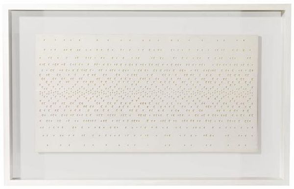Schoonhoven made 'R60-27' using painted cardboard, building a relief that almost vibrates. You get the sense he's interested in process, in what it means to repeat a form, to let the hand do its thing. The material is key; the cardboard has a texture that’s both delicate and rough. The whole thing is painted white, which could flatten it out, but instead, it highlights the shadows and the subtle variations in each little square. Look at the bottom right corner, where you can see the uneven layering of the paint, the way it pools and cracks. It’s like a tiny landscape. This piece reminds me of Agnes Martin, but where she's all about serenity, Schoonhoven has a kind of restless energy. Art is an ongoing conversation, and each artist adds their own voice, their own way of seeing.