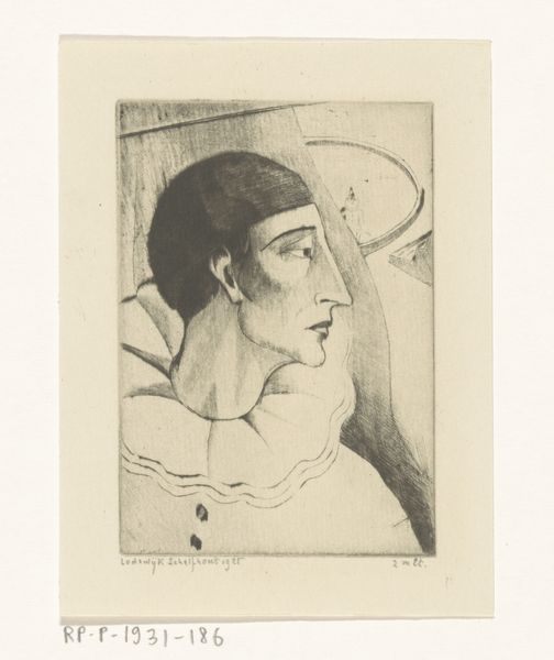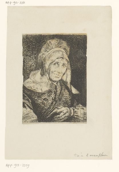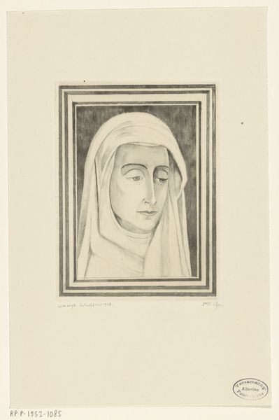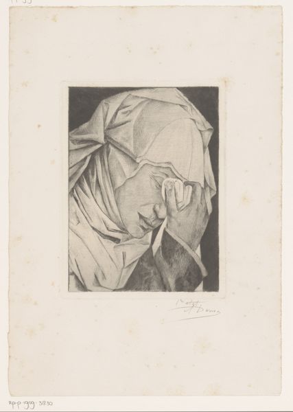 Auguste Danse created this print, "Maria als Mater dolorosa," using etching techniques. The stark monochromatic palette emphasizes the textured surfaces and amplifies the emotional depth of the subject. Danse masterfully uses chiaroscuro, casting the background in deep shadow and contrasting it with areas of stark highlight on Mary's face and drapery. This highlights the texture of the etching, drawing us into the intense grief conveyed by the subject. Mary’s upward gaze suggests a dialogue with the divine, reinforcing the symbolic weight of her sorrow. The linear precision in her facial features underscores a profound sense of suffering, transforming the personal sorrow into a symbol of universal grief. The careful arrangement of light and shadow not only enhances the realism but also serves as a vehicle to express spiritual and emotional depths, reflecting the artist's engagement with themes of sorrow, empathy, and redemption.