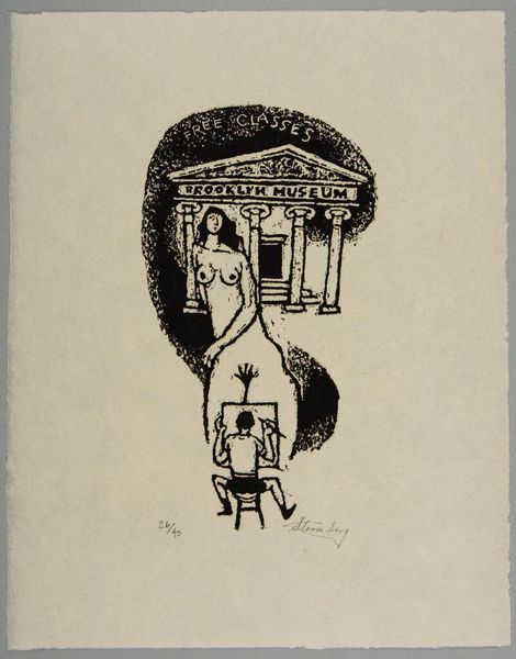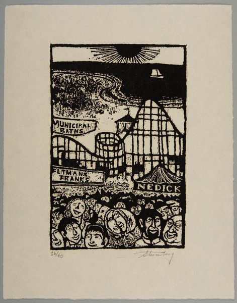 Curator: Harry Sternberg’s wood engraving, "The Bustle of New York City," captures a vibrant slice of urban life. The composition emphasizes stark contrasts, doesn't it? Editor: Totally! It feels like a pressure cooker, all that energy crammed into one block. The heavy black ink makes it both gritty and strangely intimate. Curator: Indeed. The strategic use of black and white heightens the sense of dynamism. Notice how the architectural elements—windows, fire escapes—create a grid that both contains and amplifies the chaotic scene. Editor: And the faces! All those upturned faces looking towards the buildings. It's like they're searching for something, or maybe just trying to escape the crowd. There's a bit of desperation, a bit of hope. Curator: Precisely, the artist presents a tension between confinement and aspiration, realized through the calculated arrangement of form and void. It invites semiotic analysis of urban existence. Editor: For me, it speaks to the raw, restless spirit of the city. Kind of makes me want to grab a bagel, or maybe just run for the hills. Curator: A fitting testament to the complexities embedded within the urban fabric. Editor: Yeah, Sternberg really nailed the city's pulse.