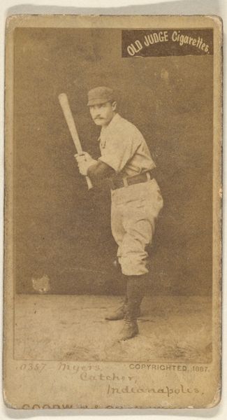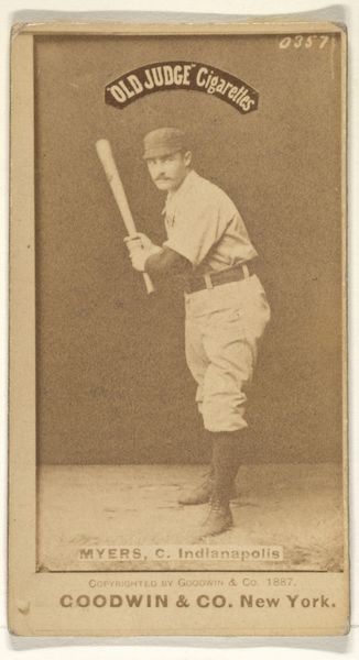 Curator: Here we have a piece titled "George Frederick 'Doggie' Miller, Catcher, Pittsburgh" produced in 1887 by Goodwin & Company as part of the Old Judge Cigarettes series. It's currently held at the Metropolitan Museum of Art. Editor: My first impression is of a sepia-toned snapshot of sporting history, though there is something rigid and posed about it. The lighting, however, seems well considered, accentuating the subject’s facial features. Curator: Indeed. This was a period where commercial culture and baseball were rapidly expanding, and these cards served as both advertisement and cultural artifact. The series itself reflected an emerging interest in celebrity and consumerism, intertwined with leisure. Editor: I agree; consider the composition; the subject, this “Doggie” Miller, is carefully positioned with his baseball bat, filling nearly the entire vertical space. Notice how his gaze is directed off to the side. Curator: The use of photography on these cards was transformative. It democratized portraiture and offered everyday fans a tangible connection to their heroes. This particular image demonstrates an intersection of early photographic techniques, printing methods, and nascent marketing strategies. Editor: Exactly, the restricted color palette is visually uniform. It adds to the serious character while the borders box the athlete within. There is something distinctly American, even austere, in this very careful framing. Curator: The “Old Judge Cigarettes” connection is key. The cards offered visibility to the players and advertised a product associated with the rising middle class. It’s a study of capitalism shaping culture. Editor: From a design perspective, the lettering below adds a structural element to the card, acting as a firm foundation. It anchors the image, giving it balance despite its simplicity. Curator: These cards circulated widely, ending up in homes, saloons, and collections, thereby embedding baseball imagery into the collective memory of the time. It is indicative of the democratization of the game through accessibility in mass media. Editor: Reflecting on it, there is indeed something both historical and immediate in its appeal. One can see its enduring popularity as a result of that balance between accessible and engaging visual cues.