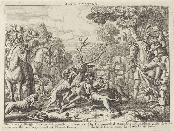 Curator: Ah, yes. Here we have Philips Galle’s “Jacht op hazen,” or “Hare Hunting,” created in 1578. It’s currently housed right here at the Rijksmuseum, and what's especially striking is that it's rendered as an engraving. Editor: Whoa. So much frenetic energy packed into a black-and-white scene. My eyes keep bouncing around; it's a landscape gone wild, with all those hounds and hunters chasing down the poor hares. It makes me feel a little… dizzy, and frankly, a little sad for the hares! Curator: The chaos definitely is part of it, yes! It reminds me of earlier Roman hunting scenes, but filtered through a distinctly Northern Renaissance lens. It’s also important to remember that hare hunting was often highly symbolic, tied to notions of earthly pleasure, perhaps even sinful abandon. Galle cleverly used line to indicate motion in every part of the piece. Even the landscape itself appears to vibrate with this pursuit! Editor: Ah, "earthly pleasure," that reminds me of Pieter Bruegel the Elder, of whom Galle was an avid follower... Makes me think the hares are us—like, average humans scurrying to avoid the hunt. Is it an analogy? Metaphor for societal pressures? Maybe Galle's giving the finger to authority in a subtle way, with all these agitated lines! Curator: (Laughs) Always the rebel artist! Could be. Though Galle often drew upon established iconography. Hunting imagery, even its potential association with unchecked impulses, had been around for centuries. The cultural memory of hunting connects deeply to dominance. Here though, you notice it isn't majestic stags these hunters chase but a very humble little hare... almost pathetic, really. That gives me a sort of ambiguous reading. Editor: Makes you wonder why someone like Galle invested so much effort depicting *that*... a hunt of these lowly hares. Anyway, this wild pursuit certainly triggers some thoughts. So much intention went into what looks like utter pandemonium. What a piece, really! Curator: Indeed. Galle's detailed engraving captures a specific moment in time while also offering glimpses into enduring human themes. Always layered, even in supposed "genre" scenes! Editor: Totally. It's far from your standard bucolic painting. Left me thinking hard, for sure.