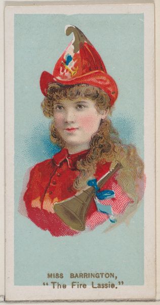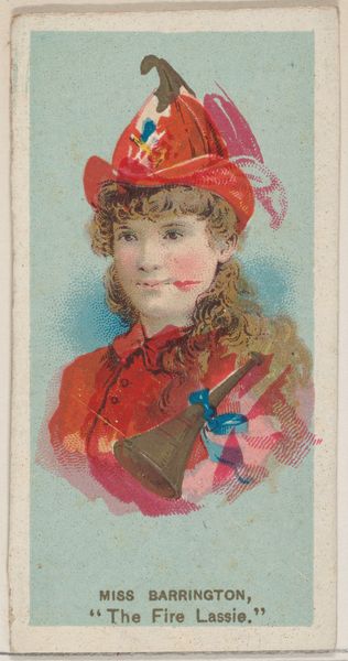 Editor: Here we have "Marion Manola as 'Bats and Rats'" created around 1889 by W. Duke, Sons & Co. It's a colour drawing, a small print actually, probably made with coloured pencils. There is a strange beauty to it, despite its simplicity and commercial nature. What stands out to you? Curator: What intrigues me is understanding this portrait not as a high art piece, but as a product within a system of production. Cigarette cards like these were essentially trade stimulators, mass-produced and distributed. Think about the materiality - cheap paper stock, the colored ink applied with likely mechanized processes. The image itself becomes secondary to the function: advertising and branding. Who was Marion Manola, and how did her image contribute to selling Duke brand cigarettes? Editor: So, it’s less about the artistic skill, and more about what this object *did* in the world? Curator: Precisely! Consider the social context: consumer culture exploding, mass media emerging. These cards helped create desire, associating the product with glamour and aspiration. Was there a workforce specifically dedicated to the card creation? Did the costuming play a role in defining standards? Look at the caricature-like representation itself. How does it affect labor involved to the commercial impact? Editor: I never really thought of art in this way – focusing on the raw materials, production and consumption cycle as much as, if not more than, artistic genius. Curator: That shift in perspective changes everything. Suddenly, a simple cigarette card becomes a rich source of information about the means of production, labor practices, and the construction of consumer desires. And by questioning that line between art and advertising, or high and low culture, we begin to see value beyond the aesthetic alone. Editor: That's definitely given me a whole new lens through which to view not only this piece, but pretty much anything. Thank you! Curator: A pleasure! Thinking materially grounds our interpretation, and makes even the most ephemeral image deeply relevant.