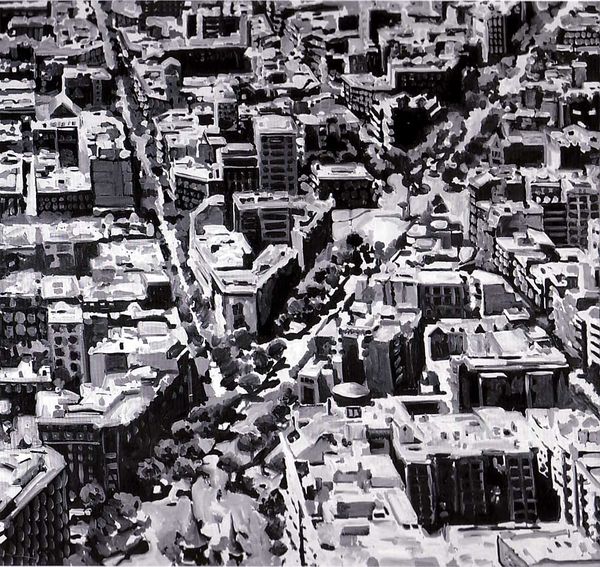 Editor: This photograph by Jack Gould, simply titled "Untitled," presents an aerial view of a sprawling industrial city. Its inverted tones give it a stark, almost dystopian feel. What do you see in this piece? Curator: I see a visual document of power and societal structures. The image speaks to the relentless march of industrialization and its impact on urban landscapes. Consider how the composition itself, the elevated viewpoint, reinforces a sense of control and surveillance. How does the lack of individual detail within the buildings reflect on the inhabitants? Editor: So, it's a commentary on the dehumanizing aspects of urban development? Curator: Precisely. And we should also consider the environmental impact, the potential for pollution and resource depletion. The image invites us to contemplate the complex relationship between progress and its consequences. Editor: That gives me a lot to think about. Thanks! Curator: Indeed. It's a powerful piece that provokes important questions about our built environment.