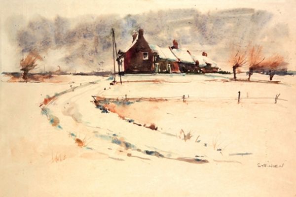 Curator: The initial impact is quite stark. There is a dominating blanket of icy color that envelops a form struggling to breathe. It is fascinating how Stefan Popescu managed to imbue such a biting winter scene with warmth. Editor: Yes, Stefan Popescu, with "Inessential Store," manages to present us with an insightful observation about the interaction between commerce and climate through his delicate brushstrokes in this landscape painting. Curator: The way that structure—ostensibly the titular ‘inessential store’— is half concealed by the landscape truly guides your vision through the surface quality and invites a formal exploration of color, and shape in order to discover that the scene's harmony results from the carefully laid structure. Editor: Absolutely. Notice how the presence of snow weighs so heavily on the shop roof, creating a direct commentary on both the commercial infrastructure and the daily labors. In truth, in what sense can the work of those working within this inessential store be seen without accounting for this? The material struggle is the crux of existence. Curator: But within this seemingly bleak setting, there's a remarkable juxtaposition of hues; this warms an otherwise somber motif! I suggest you also perceive how his confident brushwork provides the structural composition, while still being in unison with light and shadowing to convey a message. Editor: The way Popescu uses 'plein-air' here is so insightful as a way to acknowledge the social circumstances surrounding resource management and seasonal employment that are intrinsic to rural trade networks. By observing light from the landscape through outdoor painting, this further implicates our understanding of "Inessential Store" beyond a pure artistic rendering into something sociopolitical Curator: His skillful application of Impressionistic-style impasto creates an intriguing texture that leads viewers from form to the next in their immediate viewing of the subject— and that also enhances this immediate impact from a formal vantage. Editor: Agreed. Through this exploration, the ‘inessential store’ seems not merely to be inessential, but absolutely integral to understanding socioeconomic themes as we find the real store becomes one about a person’s need for making livelihoods through it all, the essence it has brought them when life asks to move beyond it and still keep up work ethic intact while faced by elements out in their faces’ views always until one takes one another outside instead. Curator: Well said, by understanding 'structure' beyond the obvious we start building meaning using 'the scene' instead solely based itself thus moving far toward creating depth/complexity, Editor: Agreed, so understanding our perspectives makes everything seem rich.