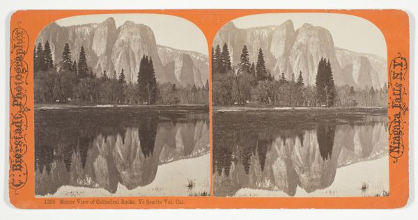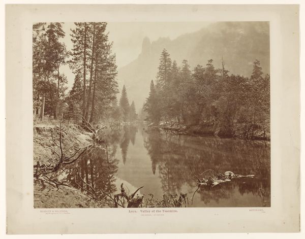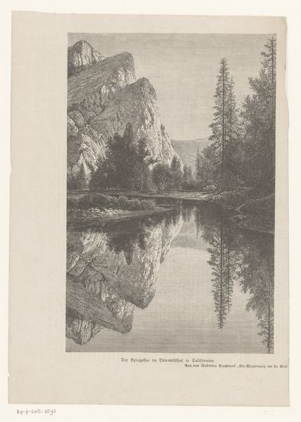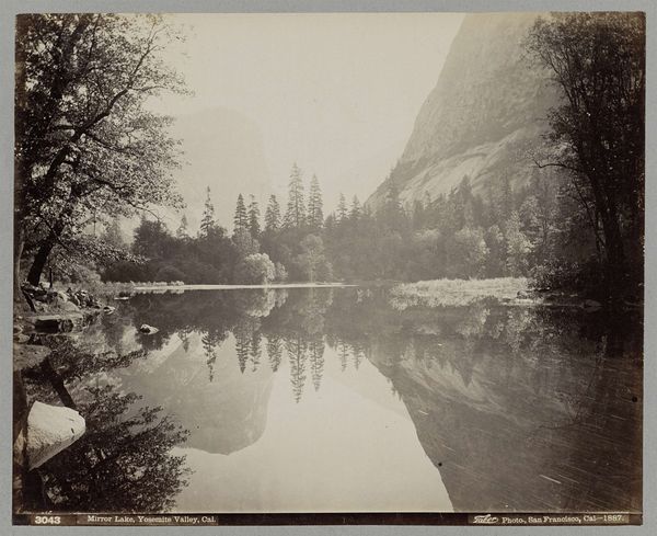 Editor: So, this gelatin silver print photograph from the late 1800s is titled "Gezicht op Mirror Lake", showing a view of Mirror Lake. It has this serene and still quality to it with such precise mirroring. What draws your eye when you look at it? Curator: I'm immediately struck by the industrial context that made this seemingly simple image possible. Think about the mining of silver needed for the gelatin silver process, and how that extraction impacted the landscape itself. This photograph, on one level capturing the sublime beauty of nature, is deeply entwined with exploitative labor practices and resource consumption. It becomes a document, perhaps unwittingly, of that early intersection of industry and wilderness. Editor: So it's not just the beauty, but what went into producing it that really speaks to you. How would this contrast to how the Hudson River School artists approached the landscape? Curator: Precisely. While artists from the Hudson River School might focus on the romantic and untouched nature, often downplaying human impact, this photograph's medium highlights the often-invisible material processes at play. It makes us consider the social and economic networks necessary to create and distribute these images, reaching a wider audience than traditional landscape paintings of the time. Did this greater access transform perceptions of landscape, leading to changes in material conditions of the locale itself through things like tourism? Editor: That's a really interesting way of looking at it. I was thinking more about the artistic choice, but framing it in terms of materials and industry changes my whole view. Curator: And seeing these historical works with fresh eyes reveals an expanded conversation about how human activities transform perceptions, representations, and physical realities. It allows us to question our own consumptive behavior, then and now. Editor: Definitely, I'll remember to always consider the entire lifecycle of the art!