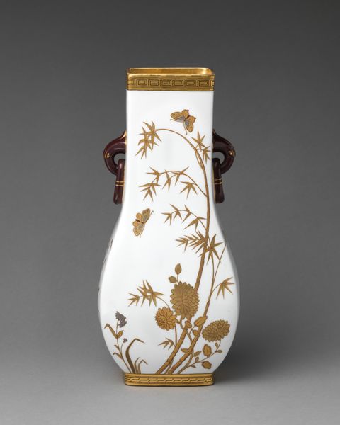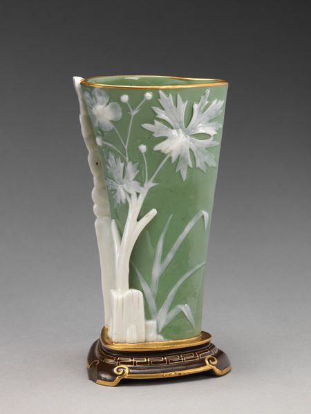 Editor: This is a spill vase from the 1890s, crafted by Minton. The striking cobalt blue porcelain, adorned with delicate gold flowers, gives it a really refined air. How would you begin to interpret the impact of the structural composition of this piece? Curator: I find myself immediately drawn to the tripartite division of the vase. We see the cylindrical body providing a smooth canvas for the floral motif, countered by the ornate, almost architectural legs supporting it. Consider the relationship between these elements. The eye moves upward, guided by the verticality of the legs, then rests on the more organic pattern. Editor: It’s interesting that you use the word architectural to describe the base, because the gilded botanical pattern feels so deliberately ornamental. Curator: Precisely. The stark blue field amplifies the effect of the metallic, almost flattened depiction of plant life, calling attention to the tension between surface and support. Does the lack of depth in the rendering of flowers bring anything to your mind? Editor: I hadn't really considered it that way, but the flatness of the applied gold contrasts with the roundness of the vessel, making it feel more like a design object, perhaps more modern than I first assumed. Curator: An astute observation. We may ponder how the play of flatness versus form, the contrast between naturalistic motif and artificial coloring, all come together. The object, therefore, may reflect its historical moment in interesting ways. It embodies a complex and compelling union. Editor: That's given me a completely new perspective on something I previously took to be simply decorative. Thank you. Curator: My pleasure. Close looking always offers new avenues for contemplation.