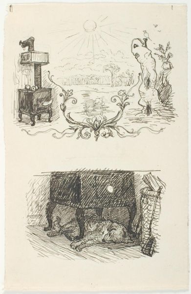 Editor: This print, simply titled "Puss in Boots" and created by an anonymous artist, depicts a whimsical scene. What strikes me is the almost unsettling mixture of fairytale charm and uncanny anthropomorphism. What do you see in this piece? Curator: I see how the artist evokes cultural memory through animal symbolism. Notice the cat with a broom – traditionally associated with domesticity, yet here it hints at a satirical inversion of social roles. What does this inversion trigger for you, psychologically? Editor: It makes me question power structures and societal expectations. Are we meant to laugh, or is there a deeper critique? Curator: Perhaps both. This image taps into our collective unconscious, where animals represent both our primal instincts and our capacity for complex social behavior, creating a powerful, if ambiguous, statement. Editor: I never thought about the cultural weight of animal symbolism. Thanks for that perspective!