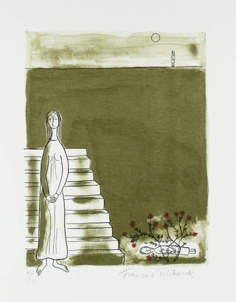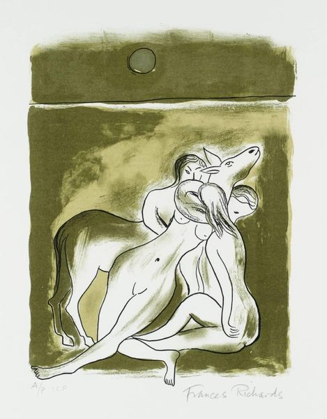 Curator: Here we have Frances Richards' lithograph "Childhood II," part of the Tate Collection. Doesn't it feel like a memory, somehow faded and ethereal? Editor: It does. The muted greens and the stark white figures give it a very dreamlike quality. I wonder about the floating figure in the background... Curator: Perhaps a representation of the boundless imagination of childhood, unburdened by gravity. Richards, working amidst the mid-20th century's socio-political upheavals, often explored themes of innocence and vulnerability in her art. Editor: So, a conscious effort to reclaim an idea of purity, perhaps? The dream figure juxtaposed with these two grounded figures definitely creates tension. Curator: Yes, a tension and a longing. And the seemingly simple lines and shapes belie a complex emotional landscape, don’t you think? Editor: Absolutely. It’s deceptively simple, yet it resonates with so much depth. Makes you think about what we lose as we grow.