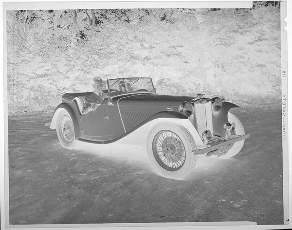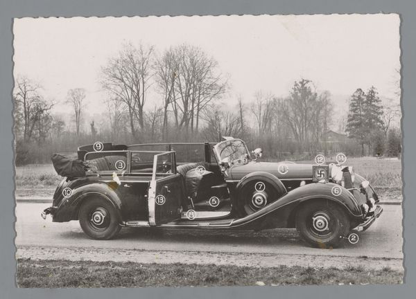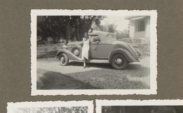 Curator: This is "Untitled (man in helmet by car)," a photograph by Lucian and Mary Brown currently held in the Harvard Art Museums. It measures about 4 by 5 inches. Editor: My first impression is of starkness, almost otherworldly, with its inverted tones. There's a strong sense of anticipation in the figure's posture. Curator: It's interesting to consider the cultural context of motorsports at the time. Racing was becoming increasingly popular, but also perceived as dangerous. This image captures that blend of excitement and risk. Editor: Exactly. And in this inversion, the image evokes the anxieties and the thrills associated with speed, technology, and perhaps even masculinity in the pre-war era. The driver almost seems to be bracing himself for the challenges ahead. Curator: That's a valid interpretation, and it highlights the power of photography to convey a complex range of emotions and attitudes. Editor: Definitely. It makes you wonder about the subject's identity, and the narrative the artist was trying to convey, and how it reflects the social narrative of the time. Curator: A fascinating piece that provides insight into the cultural dynamics of its time. Editor: It’s also a great reminder that what feels daring to one generation might seem antiquated to the next.