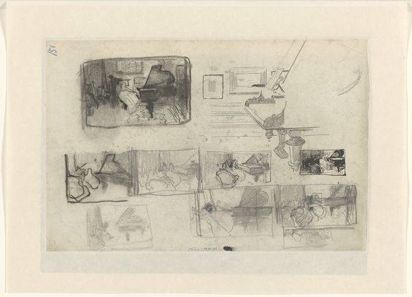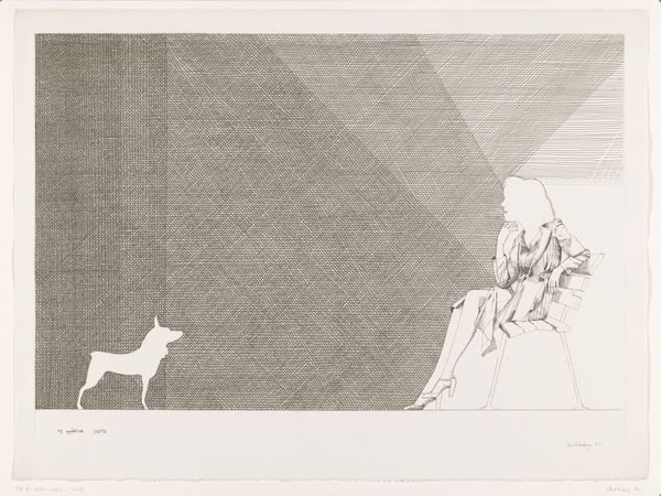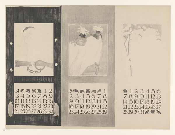 Curator: Here we have Aat Verhoog's print, "Achteromkijkende naakten en hond," which translates to "Looking Back Nudes and Dog," created before 2002. It's an ink print on paper, and currently residing here at the Rijksmuseum. What's your initial take? Editor: My first thought is that this print feels like a dream. It's unsettling and lovely at the same time. The combination of nudes, flying cherubs, and… is that a fluffy dog staring into an empty room? It’s a bit much but in a beautiful way, almost theatrical. Curator: Absolutely, I'd say there is definitely a tension between the classical nude form, and then this kind of disruption of pictorial space with floating cherubs, and the inclusion of a dog within what seems to be a liminal or staged scene. I wonder if Verhoog is interrogating the male gaze by positioning these figures as both observed and observing. Editor: I like that a lot. Observed and observing… yes. And that single dog—totally calm, facing a blank canvas. I think Verhoog’s pointing towards that quiet internal experience in art making itself—a focus without the presence of other people. I keep wanting to laugh; it’s slightly absurd but deeply knowing at the same time. Curator: The use of this collage aesthetic definitely adds another layer of meaning. It reminds me a little bit of David Hockney in the way Verhoog creates this playful sense of disorientation, which prompts viewers to ask where one space ends and another begins. This allows for commentary about sexuality, perspective, and societal expectations, all folded within a relatively small artwork. Editor: Right! All those things! This print feels almost intentionally disjointed. The dark, abstract shading is jarring to the composition, then we find roses at the corners and you ask: how is it all connected? Maybe it is only dream logic holding it together. It kind of reminds me that even reality is a construction we agree on. Curator: I think that's a very salient reading of Verhoog's intent. It certainly seems as though Verhoog wants us to reconsider the very structures that hold the world together by placing familiar icons against unexpected juxtapositions, almost poking at us with a very subtle, mischievous sensibility. Editor: Exactly, so with that I feel slightly unsettled but more fully awake somehow. Art should feel alive like that; you look and something changes within yourself.