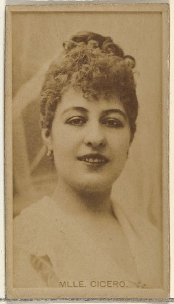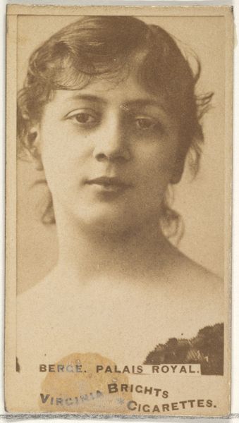Curator: This photographic print from the 1880s, entitled "Card Number 760, Miss Chaissaing, from the Actors and Actresses series," was created by W. Duke, Sons & Co. as a promotional item for Cameo Cigarettes. It's currently housed here at the Metropolitan Museum of Art. Editor: Immediately striking is the controlled tonal range and sepia palette. It lends a certain dreaminess and antiquity to Miss Chaissaing, framing her image not just as promotion but as something seemingly timeless. Curator: Absolutely. These cards were incredibly popular, embedding ideals of beauty and celebrity within the burgeoning consumer culture. The very act of collecting these cards provided a sort of tangible connection to these performers. Do you note anything unique? Editor: Well, her gaze directs our own, initiating us into some drama unseen. What seems particularly remarkable is the use of chiaroscuro— the artist makes good use of contrasting light and shadow to draw attention to her neckline. This lends not only sophistication, but offers further structural depth to the image overall. Curator: I’m compelled by her reserved expression. What does that signify? Perhaps a studied nonchalance, crucial to the mystique of an actress at the time? Also, she may signify beauty, as determined by social rules dictated by tobacco companies and printed by the millions in tiny photos... Editor: Possibly, although the relative shallowness of field creates for a sense of being enclosed by her proximity; our vantage is, paradoxically, quite intimate, given its intended purpose for distribution. Curator: Interesting thought. I consider these cards important for telling tales that can be rediscovered; how celebrities influenced ideals, how items were branded, or how a photo transformed into symbolic imagery for that era. Editor: Yes, this work serves as a valuable piece, not just of portraiture, but of visual culture. The layers it unfolds as a carefully structured photographic image and commercial object provide endless fascination.