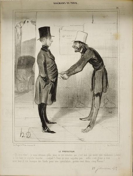 Editor: This is Paul Gavarni's print, "Hang it! Dorothy . . .". It appears to depict a somewhat comical scene with a man and woman, perhaps middle class, with a dog at their feet. What can you tell me about its context? Curator: Gavarni was known for his social satire. Given the title and the image, it is likely commenting on the domestic sphere and perhaps anxieties around social status and gender roles in 19th-century French society. Do you see how their posture communicates social commentary? Editor: I see what you mean, it's quite interesting. I hadn’t considered the poses as indicators of societal expectations. Thank you! Curator: Consider how the print was likely circulated, and to whom, and you’ll be on your way to understanding its public role.