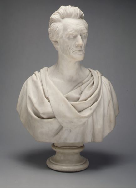 Editor: Here we have John Michael Rysbrack's marble bust of John Churchill, the 1st Duke of Marlborough, crafted sometime between 1731 and 1739. It's hard not to immediately notice the Roman-esque laurel wreath and armor. It makes me think about how heroes were portrayed then, sort of idealized and stoic. What strikes you when you look at this sculpture? Curator: Oh, absolutely, the classical references are key. It’s Rysbrack, after all! But beneath that veneer of Roman glory, I wonder if there's something more intimate trying to peek through? Look closely at the eyes, that slight furrow of the brow, is there a hint of the man behind the legend? Does it give you the impression he might actually disagree with his own hype-man? Editor: I didn’t catch that at first! So, it's like Rysbrack is balancing the Duke’s public image with perhaps a more private, thoughtful side? Is that something totally new for portraiture at the time? Curator: In a way, yes. Plenty of Baroque bluster still around, mind you! The Neoclassical style of the time, in theory, was all about conveying rational restraint, almost moral virtue through simplicity and balanced form, but, as humans are complicated, so is art. The choice to use marble is significant, of course, associating Marlborough with emperors and gods. What do you make of the inscriptions? Editor: It seems to be lauding Marlborough’s military victories, like saving various territories. It reinforces that hero narrative, I guess? Curator: Indeed, it doubles down! But consider how those texts might also shape how viewers, then and now, interpret the...shall we say, the *humanity* captured in the marble. A sculpted marketing campaign, almost. What’s your takeaway now? Editor: It feels like more than just a straightforward depiction of a war hero. Now I see layers, almost a conversation about how we construct and remember historical figures. It's clever! Curator: Precisely! Rysbrack gives us both the Duke and the *idea* of the Duke. The propaganda *is* the portrait.