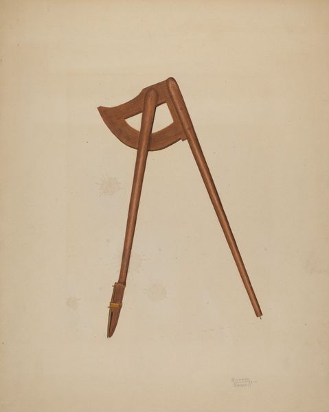 Curator: At first glance, it feels… sterile. Like a technical drawing, drained of any romanticism we might project onto the West. But compellingly sterile, I must say. Editor: You’re right, there's a clinical coolness. What we're looking at is Elizabeth Johnson's "Branding Iron," created around 1942 using watercolor and ink. There’s the iron itself rendered in careful detail, next to a sort of ghostly echo of its impression. Curator: Yes, it's almost like a blueprint, divorced from the ranch and the cattle. It’s interesting because branding irons are about identity, about making a mark. But this drawing… it’s like an identity study without a subject, floating there in an ocean of negative space. Editor: I agree. It removes the romance, emphasizing instead the act of claiming—possession distilled into graphic form. What's also fascinating is that she chose to represent this in the context of the war era. Wartime invariably increases government control over citizens and commerce, doesn't it? Perhaps, this seemingly innocuous image actually touches upon fundamental anxieties about individuality being branded or swallowed up. Curator: Oh, absolutely. I find myself wondering about the choice of watercolor; its transparent layers suggest vulnerability, a kind of visual fragility, as if to imply these identities that are burned into livestock are more permeable than they appear. Makes one ponder all the brands and branding we live with, those almost invisible and ubiquitous means of asserting power! Editor: Exactly. By presenting this as a solitary object of study, Johnson invites us to analyze those layers, both in her art, and in society at large. Curator: And what does it say, that she even took the time and attention to meticulously immortalize something we might consider as purely functional and brutal. Editor: Food for thought, certainly! I suspect many visitors will leave questioning how such commonplace tools reveal much deeper narratives about control. Curator: Here’s to tools that do double-duty—branding iron and an artist's pen creating potent conversation indeed!