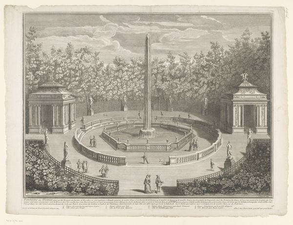 Jean-Baptiste Rigaud created this print, L'Obelisque, using etching and engraving techniques. These processes, reliant on skilled labor, allowed for the mass production of images, fueling a growing market for visual representations of luxury and leisure. Notice how the stark lines of the engraving emphasize the geometric formality of the garden design. This was a moment when landscapes were being radically reshaped to express human control over nature. Rigaud’s intricate work captures the texture of the meticulously manicured trees and the cascading water of the obelisk fountain. The very act of etching—carefully incising lines into a metal plate—mirrors the human effort required to impose such strict order on the natural world. The print also provides a glimpse into the social life of the time, depicting elegantly dressed figures strolling through the grounds. The production of such images, and the lifestyles they represent, were of course supported by a vast, often invisible, workforce. This reminds us that art and design are always embedded in complex social and economic systems. By considering the materials, making, and context of this print, we can gain a richer understanding of its cultural significance, moving beyond traditional distinctions between fine art and craft.