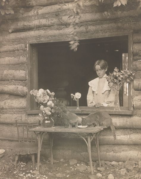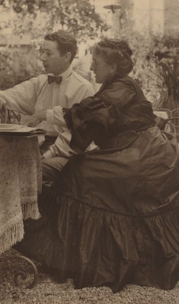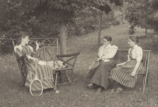 Curator: Looking at Alfred Stieglitz's gelatin-silver print, "On the Porch, Oaklawn, Lake George," taken around 1893 to 1896, what strikes you? Editor: It feels overwhelmingly staged, despite the ostensibly casual domestic scene. The lighting, the pose, everything feels… deliberate. There’s a tension between capturing a moment and constructing one that’s really compelling. Curator: Precisely. Note the carefully arranged elements: the woman, likely his wife, deep in thought at her writing desk; the languid dog curled in the wicker chair; even the placement of the hanging plant. Each component contributes to a studied harmony. The monochrome palette enhances this sense of compositional control, reducing the scene to tonal relationships. Editor: But who has access to that sort of leisure? It reads very differently through the lens of class. She’s dressed in such a cumbersome striped dress for a casual afternoon. What labor went into that presumed relaxation? And the location too–Lake George as a retreat for the elite… It’s less about the technical composition and more about the lifestyle being presented, even celebrated, wouldn't you agree? Curator: I agree it's suggestive. Stieglitz, though, was intensely concerned with elevating photography to the level of fine art. Consider the impressionistic blurring in the background. It shows Stieglitz intentionally using the camera to create painterly effects and demonstrating the artistic potential inherent in the medium. Editor: That stylistic choice, intended as artistic elevation, unintentionally reveals a privileged worldview. By focusing solely on aesthetics, it reinforces exclusion, romanticizes the lives of the affluent, and renders invisible the socio-economic structures enabling it all. What are we meant to take away from such constructed perfection? Curator: Perhaps that within the carefully arranged artifice, Stieglitz reveals not just the scene itself but also his subjective interpretation of it. The photo is both documentary and deeply personal, revealing his perception of domestic tranquility. Editor: So maybe that photograph's staged stillness is a mirror reflecting the complex relationship between art, artist, and social power, compelling us to consider who gets to be seen. Curator: Well articulated. It’s an exercise in studying visual relationships and how they reveal, and also conceal.
