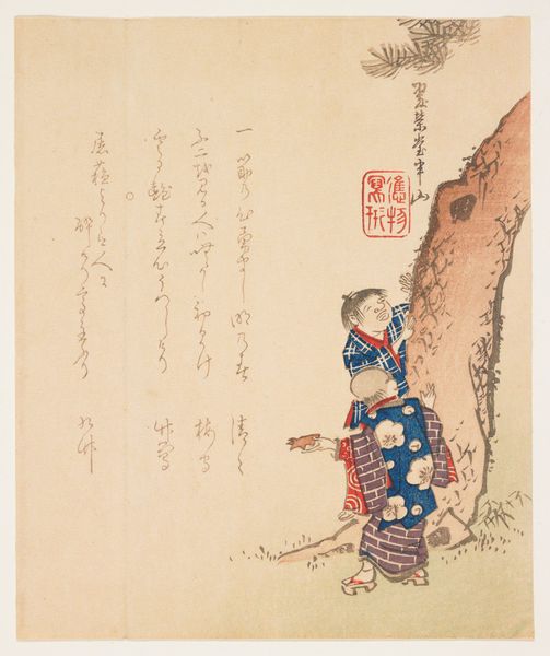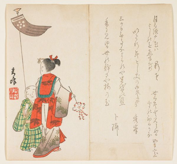 Editor: So, here we have "School Children," a woodblock print in ink and colors by Hanzan Matsukawa, dating back to around the 19th century. It's playful and quirky! What leaps out at you when you look at this image? Curator: Oh, what a delightful slice of life! You know, what strikes me first is the… the organized chaos of it all. It’s like a haiku, capturing a fleeting moment with such deliberate precision. See how the artist uses these blocks of color not just to depict the children but to create a rhythm, a sort of visual song? Editor: I see what you mean! The colors almost seem to dance together. The detail in their little robes is charming! Curator: Indeed! Ukiyo-e prints like this, they're not just pretty pictures, you see. They're mirrors reflecting the soul of a time, inviting us to eavesdrop on a forgotten conversation, to feel the gentle pulse of Edo-period life. The paper lantern as headgear – imagine the sheer, audacious joy! I’m instantly transported. Don’t you think? Editor: Absolutely! It really makes you wonder about their stories. What were they talking about? Curator: Precisely! Each line, each color, it whispers secrets of the past, teasing our imaginations. It reminds me, in a way, of trying to catch smoke - the harder you try, the more elusive it becomes, but oh, the magic is in the trying, isn't it? Editor: It really is. I’ll definitely look at Ukiyo-e prints differently from now on. Curator: That's the beauty of art, isn't it? To see the world anew, through the eyes of another.
