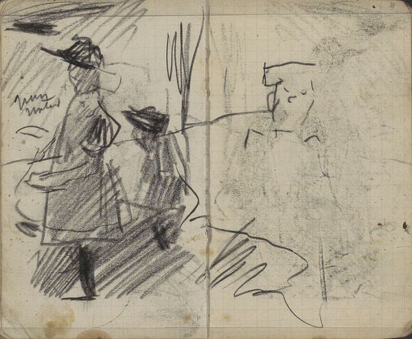 Curator: Isaac Israels created this compelling work on paper using ink around the turn of the century. It’s titled, “Three Women Talking by a Canal.” Editor: My first impression is that it feels incredibly intimate, like a fleeting glimpse into a private moment. The loose, sketch-like quality emphasizes its spontaneity, and almost... voyeuristic? Curator: It’s precisely this immediacy that captivates me. The incomplete quality emphasizes the fleeting moment Israels captured; three women engaged in conversation near a canal, frozen in time with just a few sparse strokes. Editor: I wonder, what might their lives have been like? What challenges would they have faced at the time? Considering that women were gaining traction in labor and suffrage movements around that period, you almost imagine those themes surfacing during their canal-side chat. Curator: The symbolic weight of a canal, though often overlooked, offers layers of cultural reading here. Water symbolizes life, fertility, transition... perhaps the women are at a turning point. I perceive a shared moment, amplified in its impact by how deftly it pulls familiar themes into focus through common forms. Editor: Do you think there is anything to read from his limited composition palette, or is it merely due to its sketchy format? As women have been frequently cast into black and white roles by patriarchal societies, these inky monochromatic contrasts seem to underline gender norms. Curator: That is an insightful observation. It is interesting that a work can carry that many dimensions, both symbolic and formal at once, through what seem at first like simple and immediate gestures! There is much to absorb about how his marks create not just the appearance, but something more. Editor: Agreed. Even in its incomplete form, this artwork invites reflection about intersectional identity. Israels documented the intimate lives of women in their environment while allowing us, as modern viewers, to reconstruct forgotten pieces in our collective memory. Curator: It is a reminder of how art is often in collaboration with those who witness it, a living document that persists far beyond the time in which it was originally recorded, growing with insight. Editor: It seems even incomplete or preliminary art contributes substantially towards shaping historical narratives about overlooked actors or events from centuries gone by.