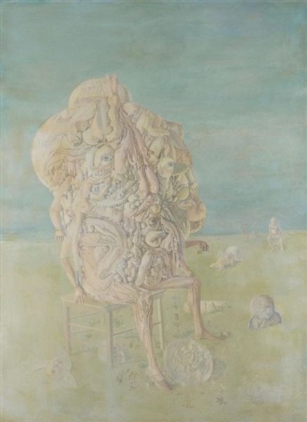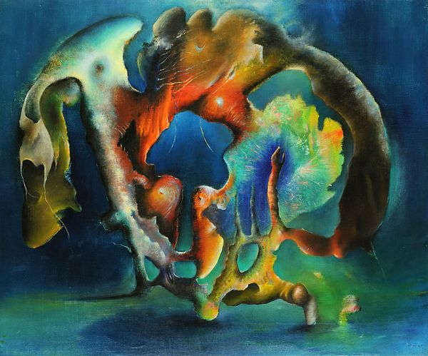 Enrico Donati created this oil painting, Le philtre II, with a process that feels like controlled chaos. The way the colors bleed and blend suggests an embrace of chance and fluidity, a letting go of strict control in favor of something emergent. The texture here is especially captivating, isn't it? See how the paint drips and pools, creating a sense of depth and movement. There’s a real physicality to the medium; it’s like Donati was wrestling with the paint, coaxing it into these unexpected forms. Look at the lower part of the central form, where the colours become more saturated, and the artist has allowed the paint to run. Donati’s surrealist approach reminds me a little of Yves Tanguy, with his biomorphic forms, but Donati brings a unique energy to the canvas. It’s a reminder that art isn’t about having all the answers, but about embracing the unknown and seeing where it leads.