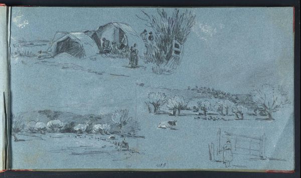 Editor: This is François Louis Thomas Francia's "Path into Grove of Trees, Woman at Edge of Water." The blue hues lend a melancholic, dreamlike quality. What symbols resonate with you? Curator: The path suggests a journey, both literal and perhaps metaphorical. Water often symbolizes purification, but the woman's presence complicates a simple reading. Do you see figures from folklore here? Editor: I do, a little. It feels like she's emerged from a myth. Curator: Indeed. The trees, clustered like sentinels, evoke ancient, sacred groves, places of transition and hidden knowledge. Her placement between water and grove... What significance does that hold for you? Editor: Maybe it's about choosing a path, between the known and the unknown. Curator: Precisely, a liminal space charged with symbolic weight. This work is a rich tapestry of cultural memory. Editor: I'll never look at landscapes the same way again. Curator: Nor will I.