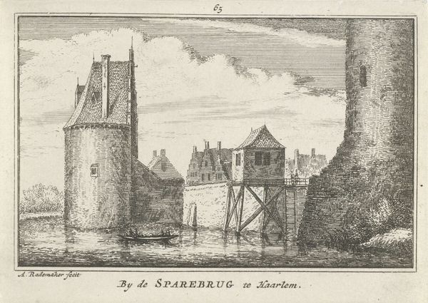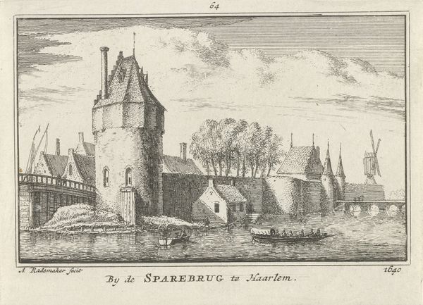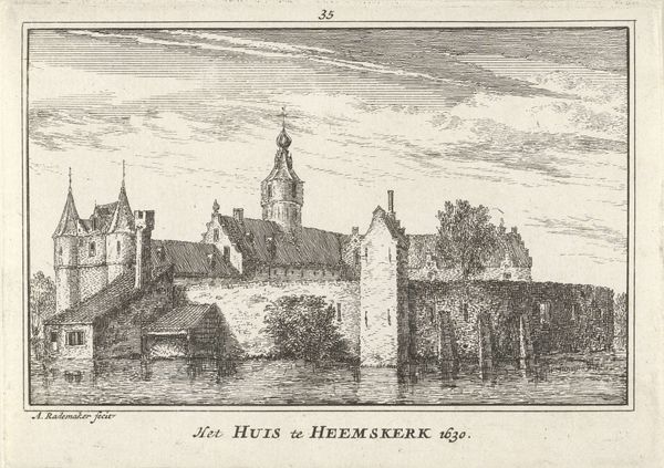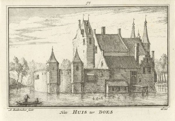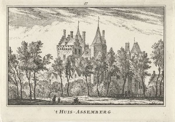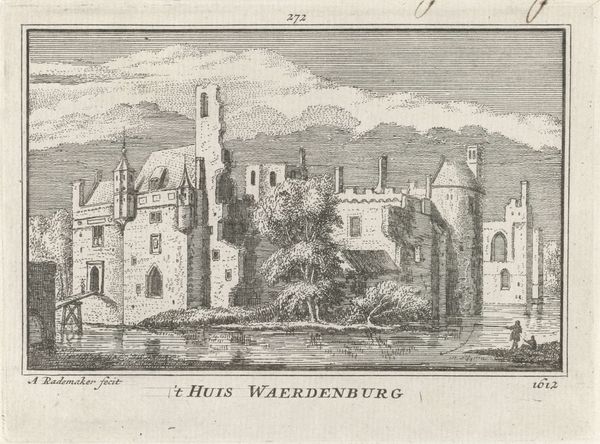 This engraving, "Gezicht op Slot Assumburg," was completed in 1611 by Abraham Rademaker. The composition arranges architectural forms and natural elements into a tranquil scene. Rademaker used line and form to define space. The stark contrast between the dark etched lines and white paper creates a sense of depth, with buildings and trees receding into the background. The castle, depicted with careful precision, acts as a solid mass which is grounded by its reflection in the water. The sky, rendered with horizontal lines, creates a sense of openness and depth. The figures along the pathway give the viewer a sense of scale. The artwork's structure emphasizes a symbolic relationship between humanity and nature. While Rademaker’s formal treatment of the buildings suggests stability, the natural surroundings evoke the passage of time. This interplay invites consideration of the artwork's complex meaning as a fusion of formal elements and cultural values.