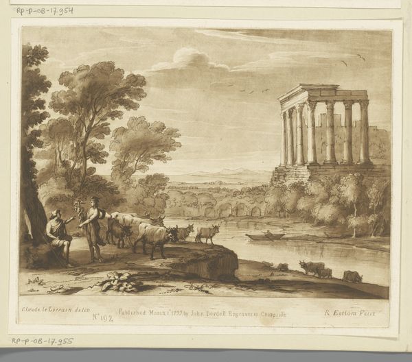 Jacques Philippe Le Bas created this etching called 'Gezicht op de Tempel van Hadrianus' sometime in the 18th century. This work emerged during a period when the Grand Tour was fashionable, and there was increased interest in classical antiquity. Le Bas's depiction of the Temple of Hadrian is more than just a visual record. It invites us to consider how history and empire were viewed through a European lens. The temple, a symbol of Roman power, is presented here as a ruin. This imagery evokes themes of decline and the transient nature of human achievement. Consider too how gender and class dynamics are subtly embedded within the artwork. While the temple speaks of public, masculine power, the figures in the foreground, rendered on a much smaller scale, offer a counterpoint. They represent the everyday lives that continue amidst these grand historical narratives. The image prompts a dialogue between the grandeur of the past and the ever-changing present. Le Bas captures a moment of reflection on power, time, and human existence.