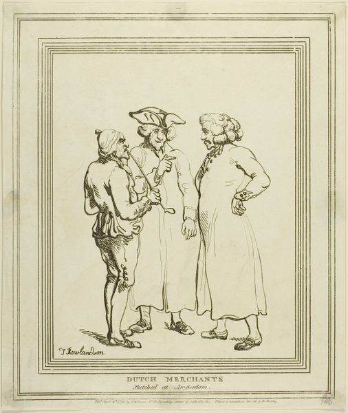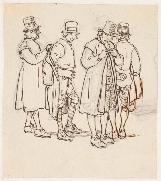 Curator: Let’s turn our attention to Martinus Rørbye's watercolor and drawing, “Three Men in Folk Costume and Clogs,” created circa 1830-1832. What’s your immediate impression? Editor: It’s charmingly understated, isn't it? Almost feels like a quick sketch snatched from a bustling marketplace, despite the somber tones. The figures, they seem to hold a quiet dignity, a contained narrative just begging to be told. Curator: Indeed. Rørbye employs the Romantic style here, which focused intently on individual subjectivity, often rooted in folklore. Note the tight control over the watercolor application. Each figure is rendered with sharp lines. Notice also how the artist captured unique physiognomies, enhancing a sense of distinct personalities despite their similar attire. Editor: You know, their stoicism is a bit deceiving. There's an underlying whimsical quality here, don't you think? It’s in the odd choice of footwear. Clogs! They add this touch of earthiness against their tailored coats, like a silent rebellion against formality. Or perhaps a subtle nod to national identity. Curator: It could be. One also cannot ignore how their very placement echoes a concern with early portraiture, despite their function as genre painting. Observe the clear foreground, with each figure precisely positioned for maximum clarity and differentiation of details in their attire. Semiotics can also come into play here. The clogs are working as signs with a range of meanings and functions: comfort, utility, regional and national identity, and so on. Editor: They definitely pull me in. What fascinates is the lack of setting. It forces me to concentrate on the subjects. Makes you imagine what stories they might hold or what their concerns might be. They are like ordinary citizens elevated for an unceremonious but poignant introduction. Curator: Ultimately, this watercolor provides a vignette of Danish society. Rørbye captured a moment that’s simultaneously typical and uniquely character-driven. It invites sustained looking. Editor: I agree. A small snapshot into a bigger picture, really. A poignant reminder of the stories woven into everyday life, rendered with a delicate hand.