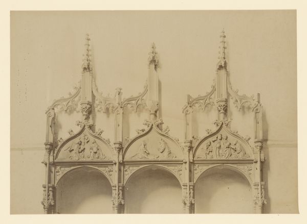 Editor: Here we have a photograph entitled "Portaal van een kathedraal, mogelijk van de Kathedraal van het Heilig Kruis en Sint Eulalia in Barcelona," created after 1880 by Juan Laurent, using the albumen print process. The overwhelming detail and delicate latticework have an almost hypnotic effect on me. How would you interpret the intense visual symbolism at play here? Curator: This is an incredible capture of Gothic architecture’s symbolic language. Notice how the verticality emphasizes the aspiration towards the divine, a common visual motif. The trefoil patterns, repeated endlessly, can be seen as representations of the Trinity. What does the play of light and shadow across the stone suggest to you? Editor: Well, the high contrast almost flattens the surface, yet it also amplifies the intricacy of the carving, like the stone is breathing. The three portals create a sense of depth but also invite comparison; each seems both similar and unique. Curator: Precisely! The individual within a larger structure, reflecting shared faith, but with their own relationship to the sacred. Consider also the cultural memory embedded in Gothic architecture. These spaces weren’t just built, they were felt, experienced collectively. What do you imagine such a space representing for those entering in Laurent's time, especially as photography began to spread such imagery? Editor: It would probably seem familiar while also evoking a sense of wonder at the skill of the architecture. It seems the picture offers a wider view of such sacred and ornamented buildings. I never truly thought of cultural memory imbedded in structures before; how powerful an idea. Curator: Exactly. This is the continuity we must search for, acknowledging architecture not just as physical space but a living embodiment of history. This really brings so much history into one single image!