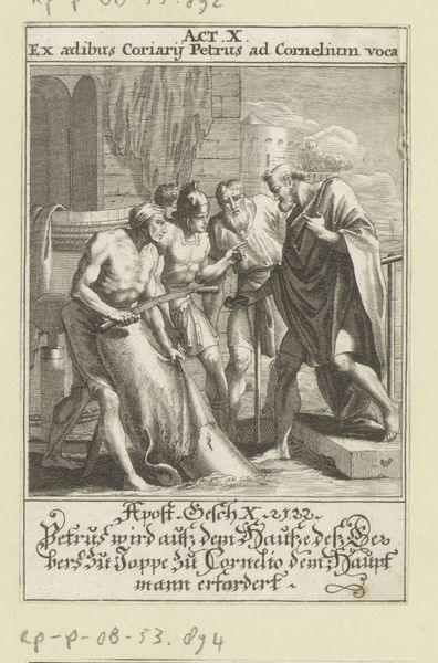 Editor: This engraving, titled "Saul door Samuël tot koning gezalfd" by Christoffel van (II) Sichem, dating sometime between 1645 and 1740… it's a powerful depiction of the anointing of Saul. It's quite striking how the linear style emphasizes the weight of the figures and the stone arch. What can you tell me about its significance? Curator: Well, considering the socio-political context of the 17th and 18th centuries, the imagery takes on added weight. Think about the Dutch Republic's own struggles with leadership and governance. Depicting a biblical scene of divine right at this time, even indirectly, reinforces prevailing societal hierarchies and values, doesn’t it? What’s most interesting here is that this image probably helped to consolidate and reflect opinions on power during this historical time. It depicts not just a king, but kingship ordained through a religious framework, lending authority that’s very compelling to a wide audience. Editor: That makes perfect sense. The figures and the composition are almost secondary to the concept of divinely appointed leadership that the image tries to convey. So, are you saying the artist is commenting on the power dynamics of the time, subtly reinforcing certain political viewpoints through a seemingly simple historical scene? Curator: Precisely! It is a reinforcement, because this image makes an argument; arguments exist within society; and they interact in very interesting and profound ways. Consider how it circulated as a print; how many people might have engaged with it? Editor: Wow, I hadn't considered the impact on public opinion! This image becomes much more than just a Bible story, and a reminder that imagery like this carries real cultural and political implications. Curator: Exactly. This highlights how art actively shapes, or sometimes reinforces, our understanding of authority. And vice versa – art always helps us better understand society and history.