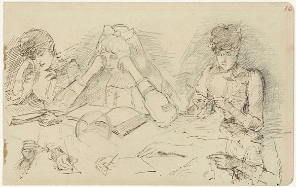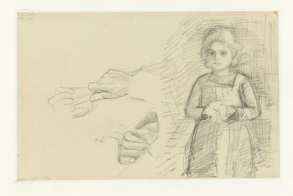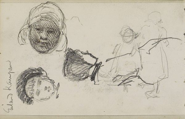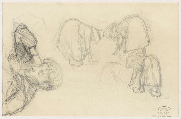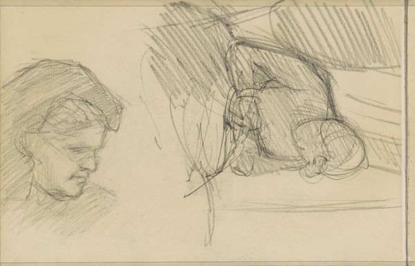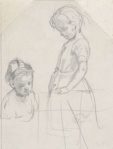 This work, "Two Studies of a Girl and a Horse," was created by Jozef Israëls with graphite on paper. The studies are loosely sketched, emphasizing line and form over detailed representation, capturing a sense of motion and momentary observation. The composition is divided into two distinct groupings. The first drawing on the left is of a girl, the network of lines defining her form, while the second on the right, appears to depict the girl with a horse. The structure of the sketch is about capturing the subject's essence rather than providing a complete picture. Notice the use of hatching to create depth and shadow. Here, the unfinished quality invites us to consider the process of seeing and the role of the artist in translating fleeting perceptions into enduring forms. It emphasizes that the value lies not only in the final image but also in the act of exploration and discovery.