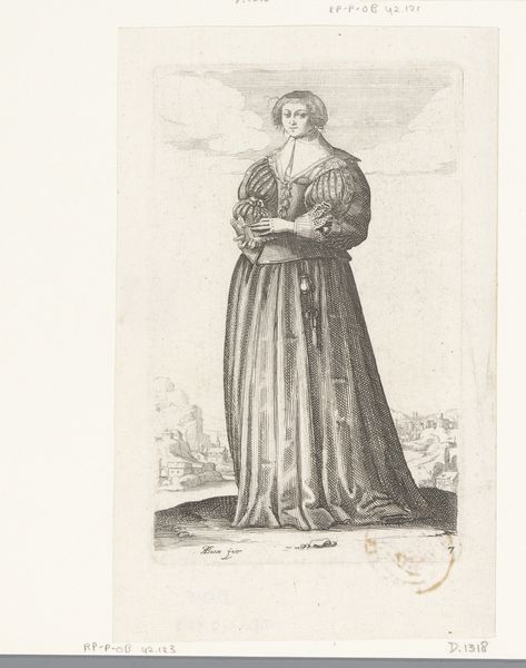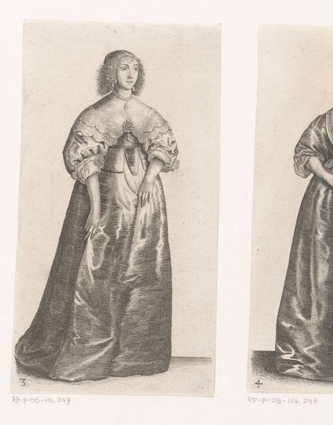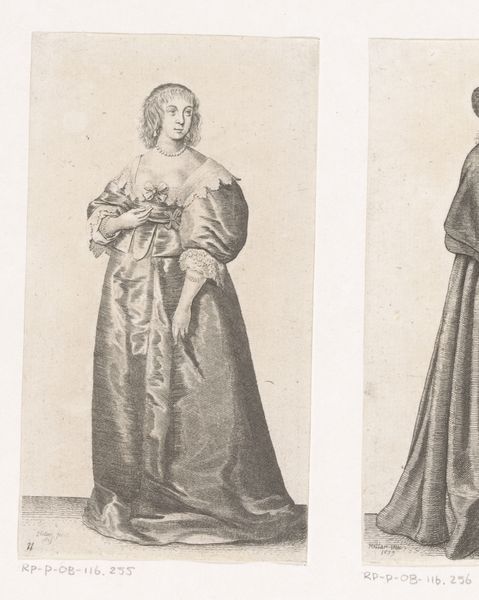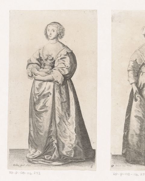 This is ‘Engelse vrouw van stand met vouwwaaier’ – or 'English noblewoman with folding fan' – made by Wenceslaus Hollar, a prolific printmaker of the 17th century. The technique is etching, using acid to bite lines into a metal plate, which is then inked and printed. Hollar was a master of this method, particularly in his rendering of textiles. Look closely, and you can almost hear the rustle of this woman’s dress. The fabric practically shimmers, thanks to Hollar’s intricate cross-hatching. Prints like this were relatively affordable, which meant that fashion trends could circulate widely. This image is not just a portrait, but also a valuable document of sartorial culture at the time. Consider, though, that the fashion industry of that era relied on exploited labor. Sumptuous fabrics were made by skilled workers often laboring in harsh conditions. Hollar’s print, exquisite as it is, invites us to reflect on the social realities behind luxury. By appreciating the artist's technique, and considering the complex labor involved in its production, we gain a fuller appreciation of the artwork.