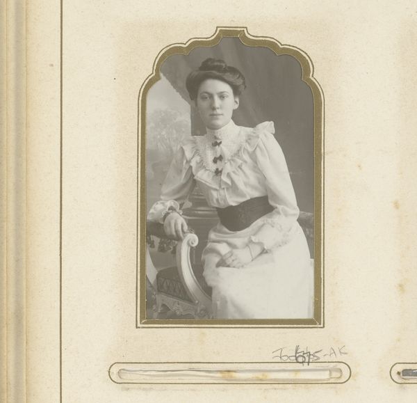 Curator: Here we see Machiel Hendricus Laddé’s portrait of a standing woman, created sometime between 1892 and 1906. It's a photographic print, currently residing here at the Rijksmuseum. Editor: The elegance of it strikes me immediately. There's a subtle asymmetry in her pose, but her stern gaze grounds the image. The tonal range in the photograph seems quite narrow though, doesn’t it? Curator: Indeed. Laddé plays with texture—the delicate lace, the smoothness of the parasol, the feathery embellishments on her hat—to create visual interest without strong contrast. Notice how the light defines the planes of her face. Editor: I’m curious about the conventions that governed female portraiture during this time. Was this how women presented themselves to society or was there pressure? We can see the high collar and the cinched waist, reflecting social codes of the era. It is important to remember that these choices are not apolitical. Curator: It speaks to a moment of shifting class and gender roles in society, reflected here through dress and demeanor. There’s an intentional use of backdrop, soft and out of focus, but suggesting an engagement with the outside world beyond the confines of her domestic life. The details matter, her lace trimmed collar, the way she holds the parasol as if it's a status symbol as much as an object. Editor: It seems this could almost function as a trade card of some sort: announcing this young lady’s arrival in a given social season? This studio portrait, placed within this ornate decorative surround, hints at its wider use and function. How it can function as a calling card of sorts to mark and position someone of high status. Curator: Absolutely. While Laddé might have approached the project with his own intentions as the photographer, this sitter must have had expectations for the artwork that align with her place and role. It is precisely the dance between maker, sitter, and cultural conventions that creates an enduring portrait. Editor: It allows for discussion and thinking about broader society by decoding the historical implications through its forms and composition, that much is true.