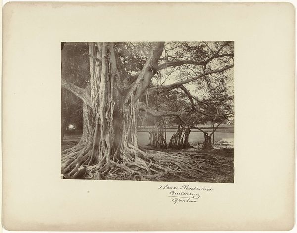 Editor: So, this is Francis Frith's "The Largest of the Cedars, Mount Lebanon," an albumen print from 1857. It feels quite imposing, this giant tree dominating the frame. What do you see in its composition that stands out to you? Curator: I am drawn to the way the photographer employs light and shadow to define form. Consider the stark contrast between the sunlit branches and the darkened recesses of the tree's trunk. This creates a profound sense of depth and texture. Note how the structure is established using the Rule of Thirds, placing the center tree slightly to the right, does it alter your perspective in any manner? Editor: I hadn't thought of the composition itself creating depth, I was mostly caught up in what it represents. So the texture comes from the highlights and shadows, and the rule of thirds adds a structural element, rather than just a snapshot. I am learning a lot! Curator: Exactly. Now observe how Frith uses the smaller trees in the background, the smaller, and fainter versions contribute to the texture in a subtle manner. Editor: Ah, yes, the receding trees almost flatten themselves in the background, whereas that enormous cedar jumps out towards us. Curator: Precise, this juxtaposition reinforces a hierarchical reading of forms and scales within the artwork. Furthermore, how does the placement of the man sitting at the base of the large tree impact the viewer? Editor: He's so small! He adds a sense of scale, right? By emphasizing that difference in size, and its effectiveness on this. So, through contrasting forms, we create meaning. Curator: Precisely. By analysing intrinsic elements, we can comprehend how photographic choices amplify specific readings. Editor: This focus on the elements of form really changes how I'll look at photographs now. Thank you.