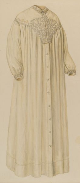 Curator: This artwork, known as "Woman's Dress", was created sometime between 1935 and 1942. It’s rendered using watercolor and colored pencil on paper and depicts just what the title suggests. Editor: It has an undeniable nostalgic aura, doesn’t it? The choice of these vertically draped brown and pale yellow textiles with the more centrally positioned and emerald green checked textile is really eye-catching! There’s an old worldliness about it, wouldn't you say? Curator: Indeed. Focusing on its materiality, we might consider how the textile industry and ready-to-wear clothing transformed women's lives during this period. Mass production democratized fashion, yet also created new forms of labor and exploitation, influencing representation. Editor: I’m captivated by how the contrasting stripes and the central plaid interact formally. Look at how the artist employed various line weights. Those two dangling tassels contribute texture that almost softens the rigidity of the perpendicular composition. And those subtle, watercolour bleeds - masterful! Curator: Precisely, the choice of such techniques like watercolor is very deliberate here to help give the dress a form that has body while allowing it to come across as airy, but one must think too how women navigated societal expectations during the mid-20th century through clothing. Fashion became an expression of both conformity and individuality within a rapidly changing world. What choices are women offered through such a garment? Editor: Absolutely. This piece speaks volumes. Even just that dainty ruffled collar; one could spend a considerable amount of time examining each textile and it's various relationship within this two dimensional surface. Curator: Reflecting on it, it seems more than a representation of fashion; it's a statement of the evolving role of women in society, materialized through a lens that invites dialogue. Editor: Yes, ultimately the artist guides us through the garment as artifact; while revealing visual textures through very keen compositional strategy, a silent dialogue that speaks volumes!