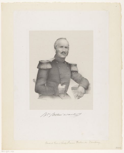 Editor: Here we have the "Portret van Edmond-Charles de Martimprey," an engraving from 1859 by Jean-Baptiste Adolphe Lafosse, currently housed at the Rijksmuseum. My first thought? It’s striking how formal and almost severe the subject appears. What are your impressions of this portrait? Curator: Well, what a grand fellow he appears to be, standing ramrod straight in full regalia! Looking at this portrait, I'm immediately drawn to the precision of the engraving. Can you see how Lafosse captured every detail of his uniform, medals, and even the subtle lines in his face? Think about the social context for a moment. Mid-19th century: status and power were often visually declared, wouldn't you agree? Editor: Definitely! It’s almost like the medals are shouting his accomplishments. Is there anything more to it than a show of status? Curator: Oh, there's always more if you look closely! Consider the lack of background. Why strip it away so completely? To emphasize the man himself, surely, his presence, his…authority. Though, between you and me, the artist *did* have to make him a tad more heroic, eh? A gentle nip and tuck by way of artistry, perhaps. What do *you* think it reveals about Martimprey himself? Editor: Hmm, maybe that he wanted to be remembered in a very particular, almost larger-than-life way. Curator: Precisely! Portraits were the Instagram of the 19th century. It’s carefully curated persona. Next time you're tempted to present only the shiniest version of yourself to the world, remember Edmond-Charles de Martimprey and his very deliberate portrait! Editor: That's a great way to think about it! I’ll definitely see portraits in a new light from now on!