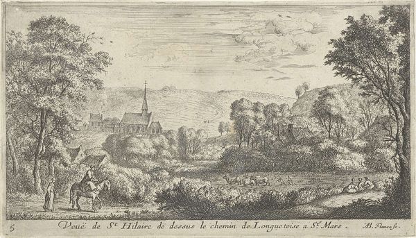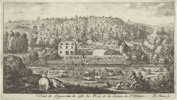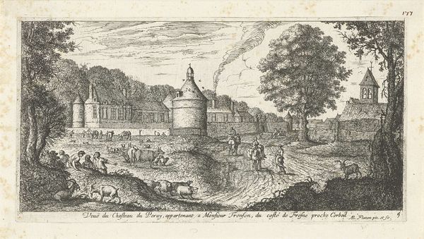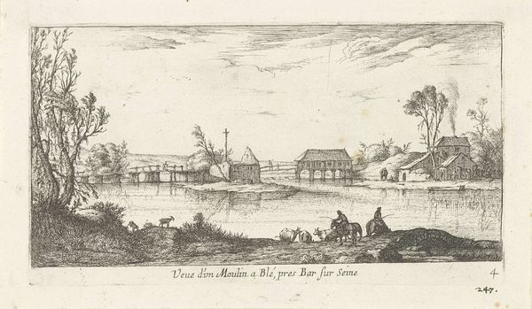 Albert Flamen made this etching, Watermolen bij Essonne, sometime in the 17th century. With its stark lines and intricate detail, the printmaking process lends itself well to depicting the industrial landscape of the watermill. The dense crosshatching creates areas of shadow, which gives depth to the buildings, vegetation, and figures populating the scene. Notice the textural contrast between the smooth paper and the rough, etched lines, almost mimicking the contrast between the mill's architecture and the surrounding natural environment. The etching process itself speaks to the burgeoning print industry of the time, enabling the mass production and dissemination of images. This connects the artwork to broader social issues of labor, politics, and consumption, inviting us to consider the amount of work involved in the production process, both in the making of the print and in the operation of the mill itself. Ultimately, understanding the materials, making, and context of this artwork allows us to appreciate its full meaning and significance.